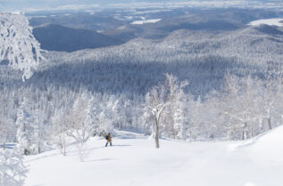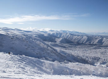レストランから数十分、田園風景に調和した森に、大雪山のシルエットに抱かれた景色が印象..